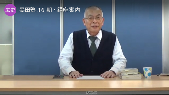36期の受講をご検討の方は、黒田塾36期生・講座案内のPDF資料「講座案内資料を見る」をご覧ください(動画配信はございません)。